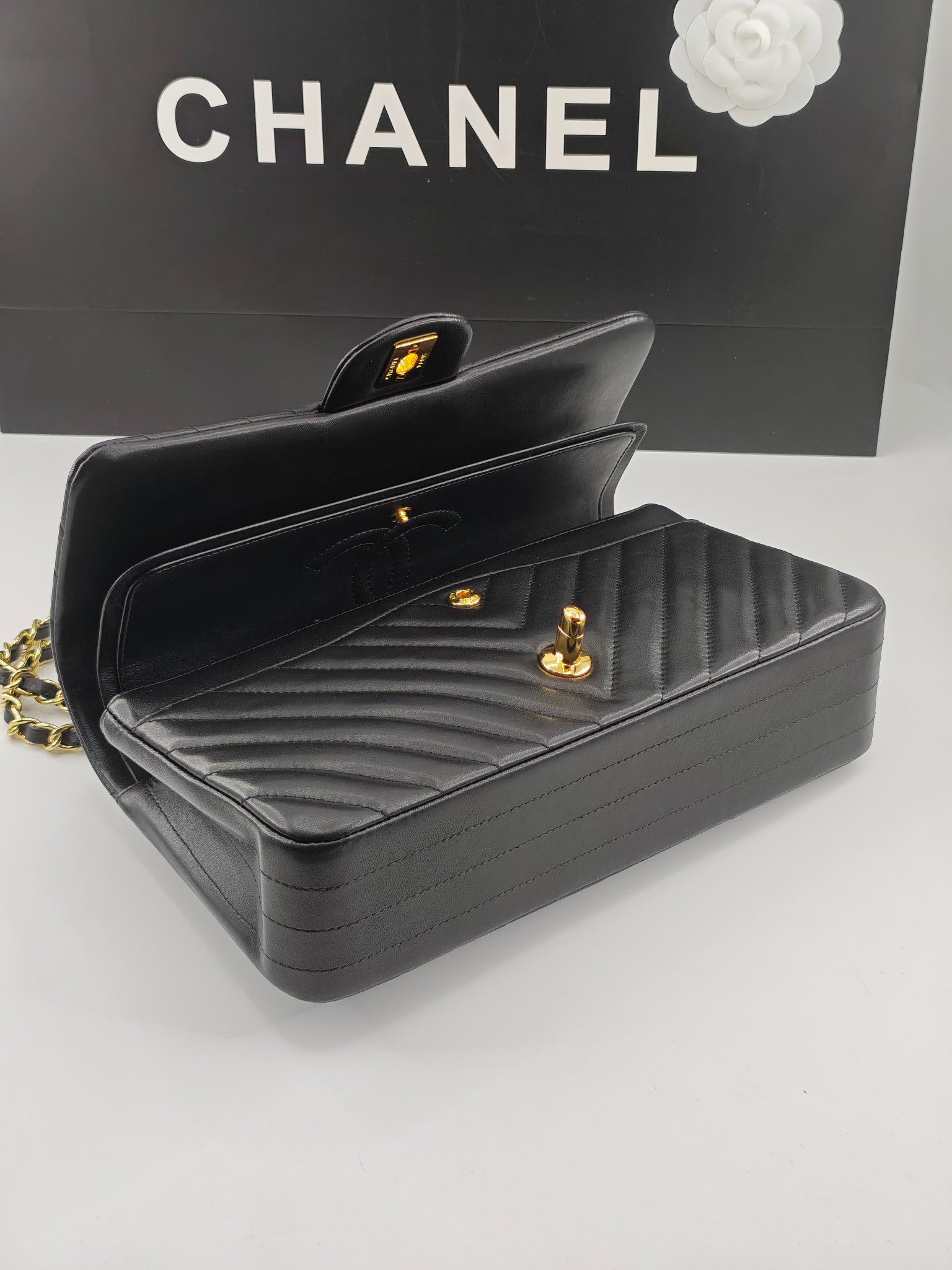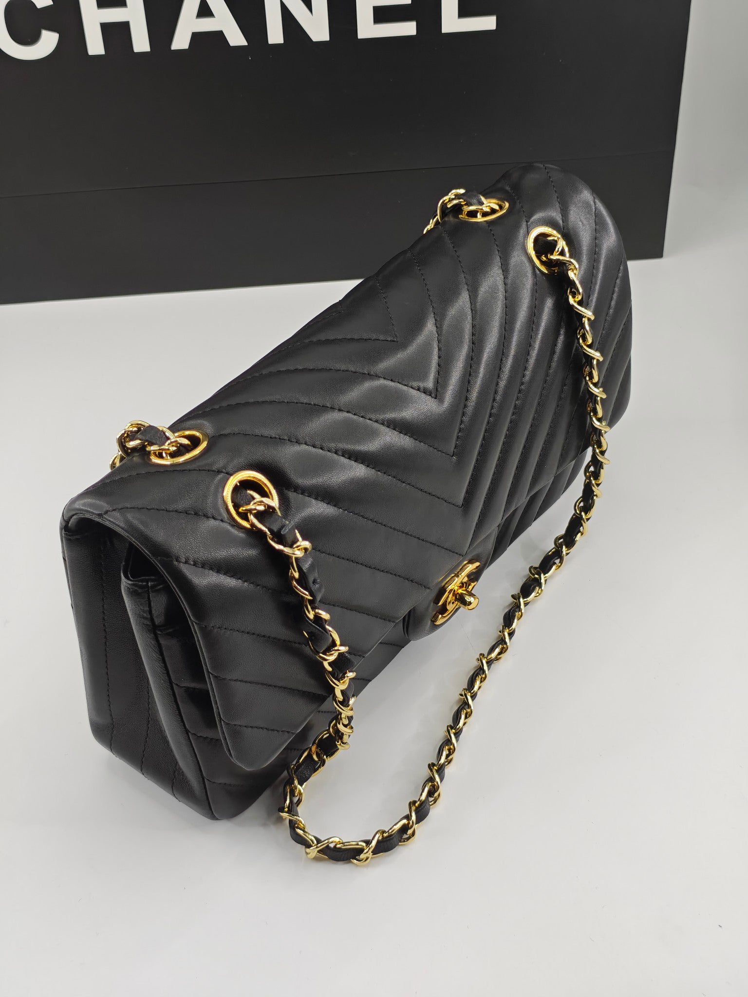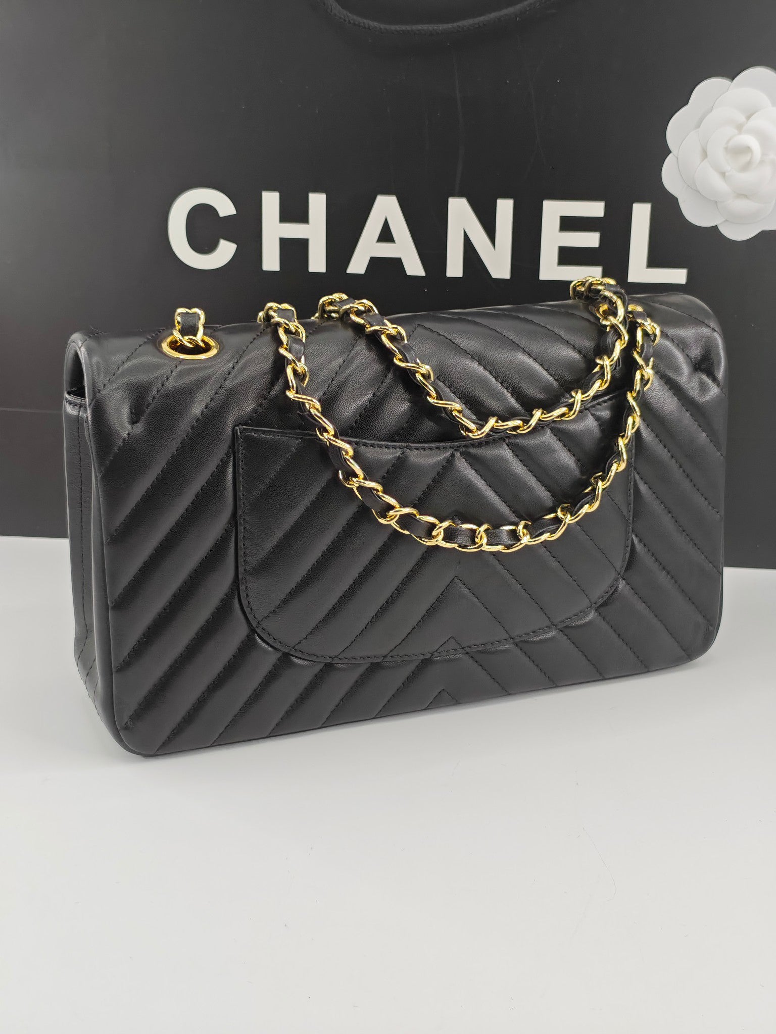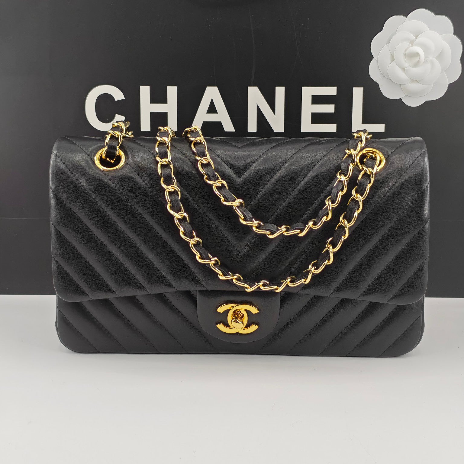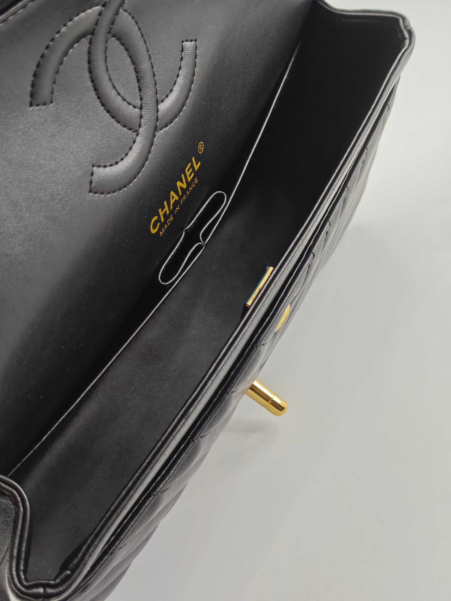 Chanel CF1112 Classic Black Gold Lambskin Bag | Stamped Chip Edition | 24K Gold Plated Hardware | Luxury Choice for Gatherings