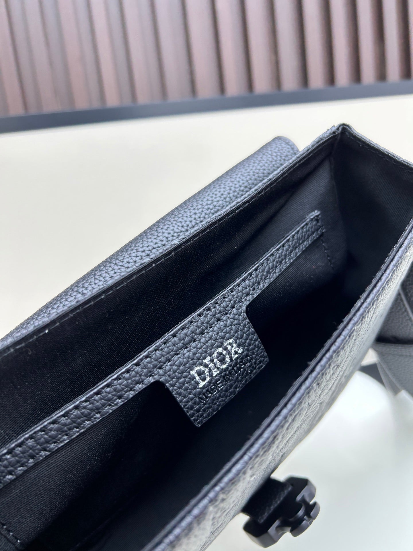Description: DIOR GRAVITY embossed calfskin messenger bag with 23x17x6cm capacity for laptop. Convertible strap transitions from office to date night. Featuring grained black leather and signature metal hardware for timeless elegance.