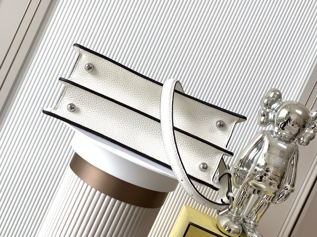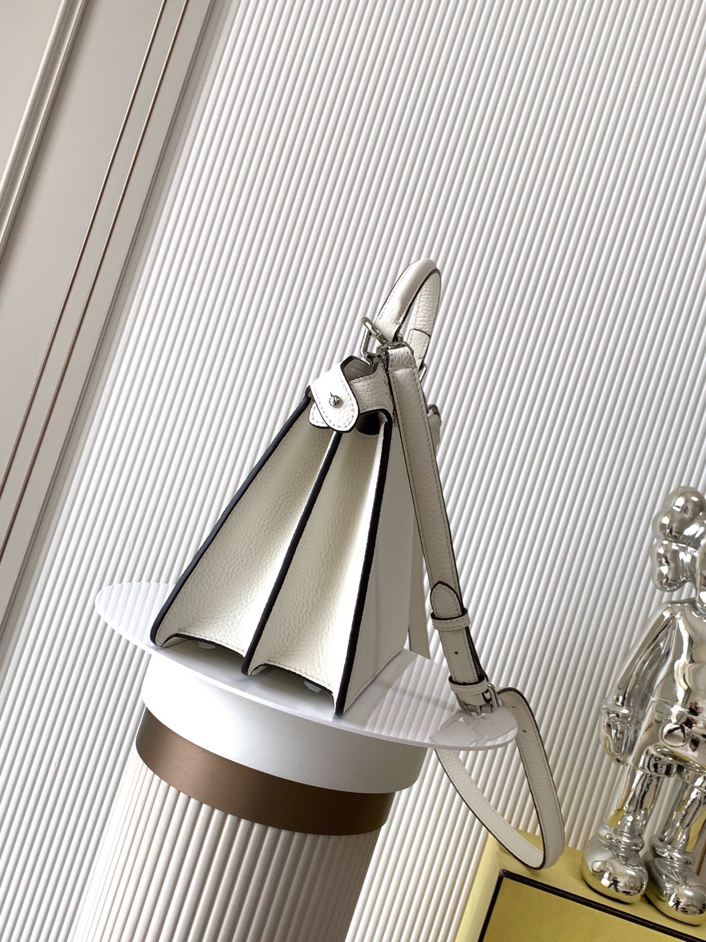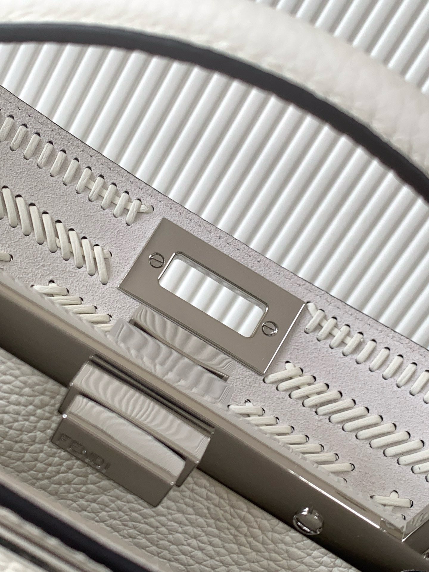 The iconic Fendi Peekaboo ISeeU small bag is crafted from white Cuoio Romano calfskin, featuring a natural grain texture for luxurious appeal. The bag highlights a handwoven diagonal FF motif, showcasing Fendi's artisanal expertise. With a liner-free design and structured calfskin dividers, it offers two functional compartments plus an inner pocket. Silver bar closures and signature twist locks adorn the sides, blending utility with elegance. The adjustable and detachable strap allows for hand-carry, shoulder, or crossbody wear. Made in Italy, measuring 27×21×11 cm, it balances capacity with sophistication