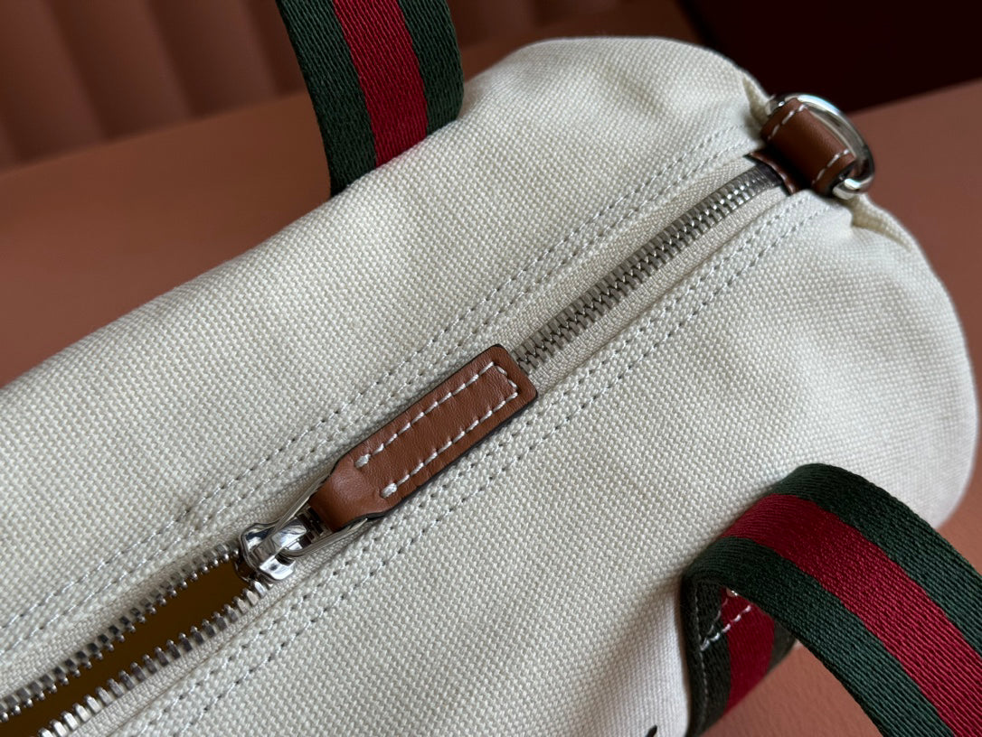 Gucci Spring Summer 2025 Men's Canvas Travel Bag | Navy Leather Trim Red-Green Web Strap Made in Italy Emblem