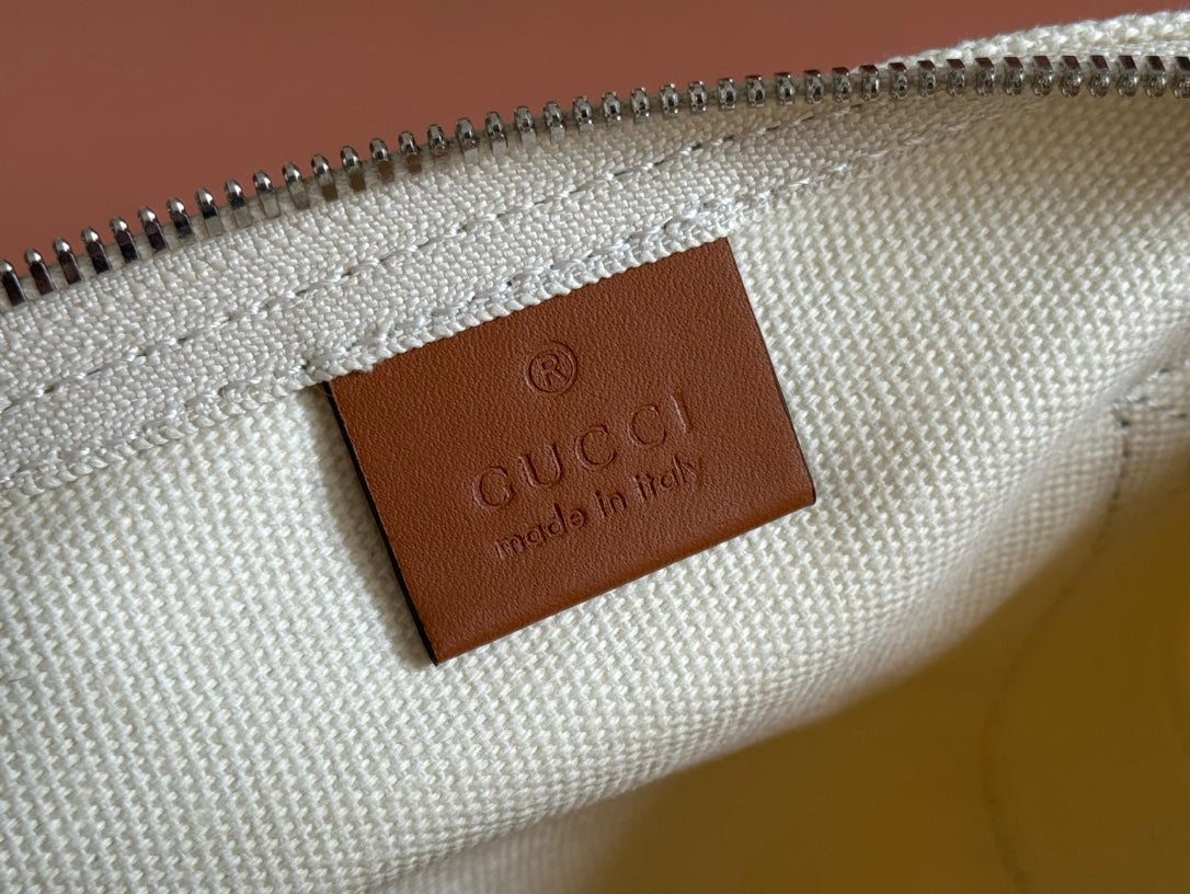 Crafted with Precision: White canvas body accented with navy leather trim, topstitched details, and the iconic "Gucci Made in Italy" emblem. Vintage-inspired red-green web strap adds a pop of heritage flair.