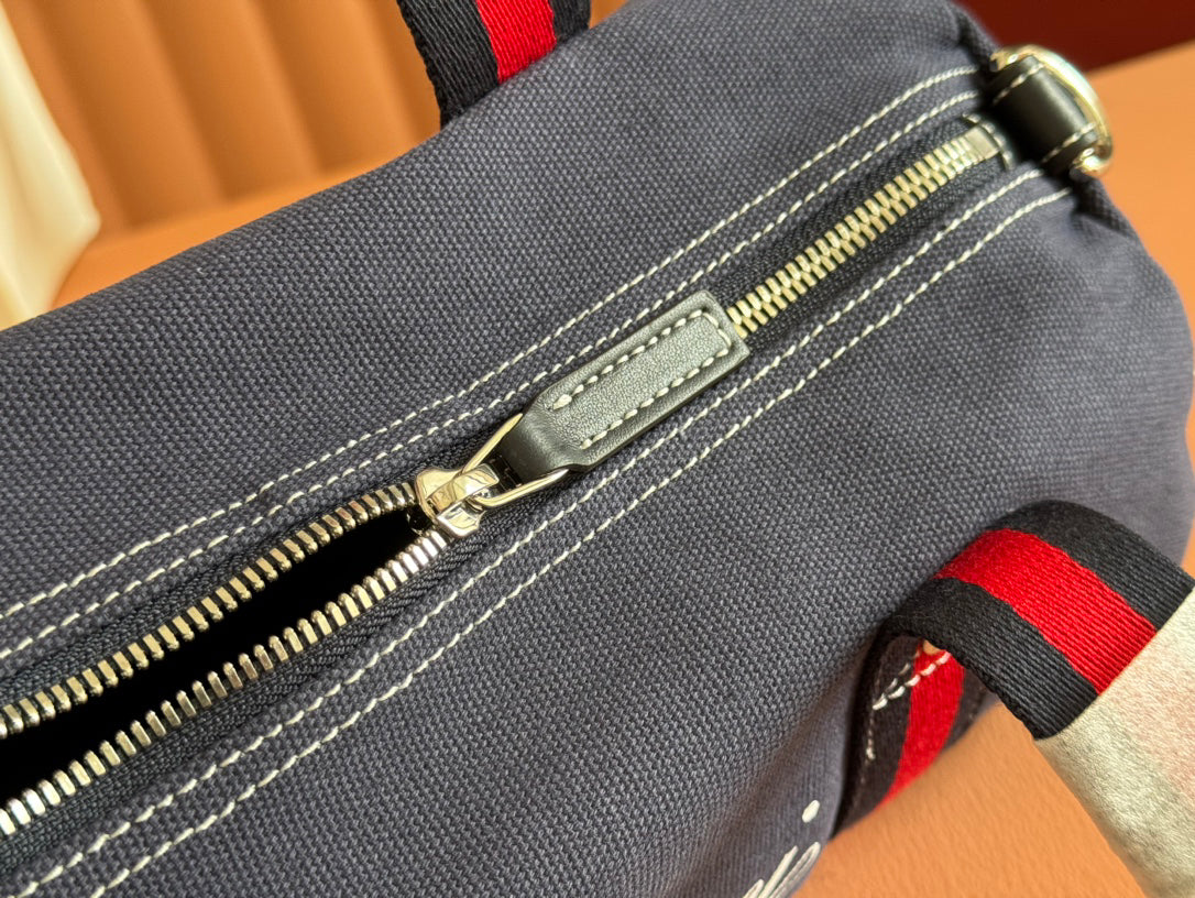 Gucci Spring Summer 2025 Men's Navy Canvas Travel Bag | Blue Leather Trim, Red-Green Web Strap, "Made in Italy" Emblem