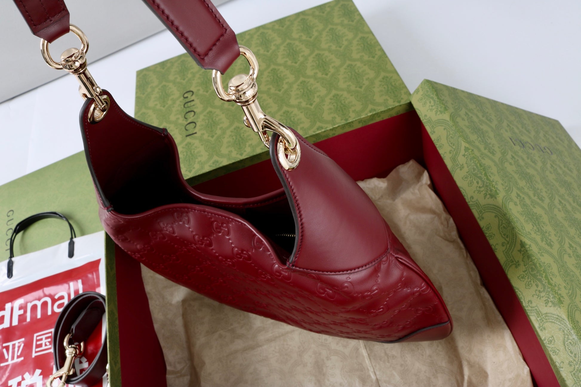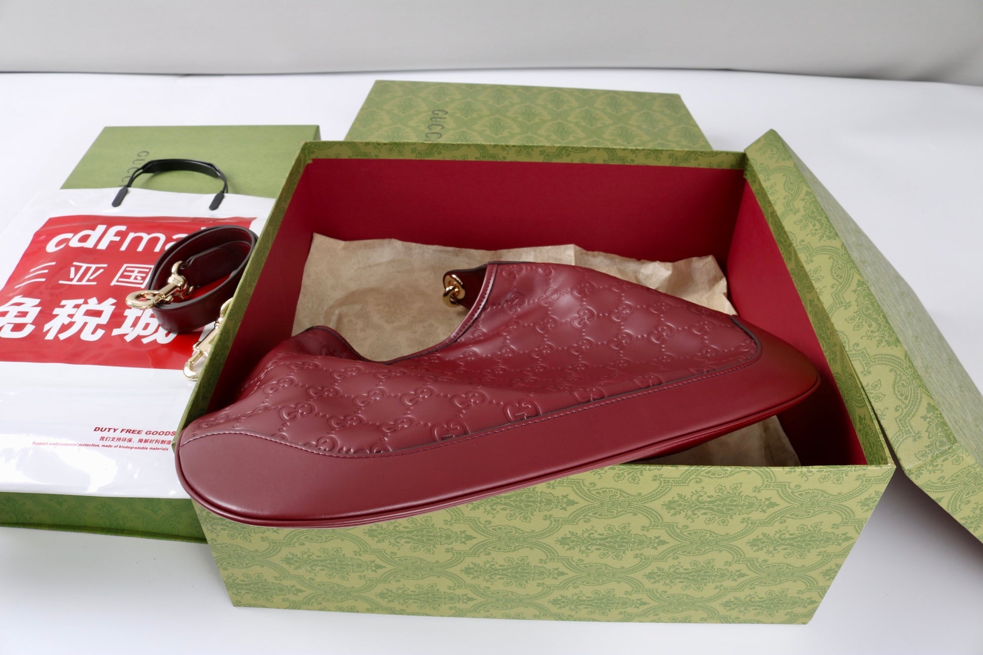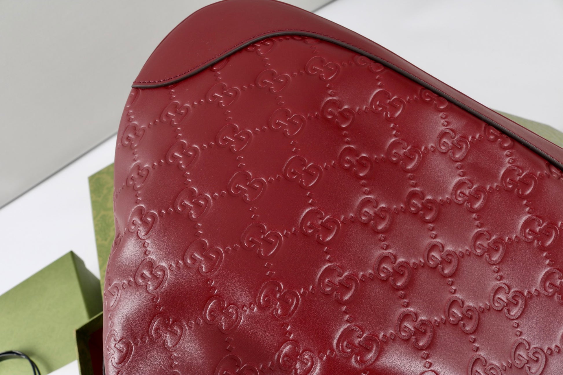 The Gucci Body Double Lock Shoulder Bag reimagines the archival elegance of the 1950s with a modern twist. Crafted from supple imported calfskin adorned with the iconic GG embossed motif, this shoulder bag features a fluid silhouette enhanced by Ankara red leather trim. Meticulous details elevate its vintage charm: antique silver-toned double-lock hardware and a light gold magnetic clasp closure blend timeless sophistication with functionality. Measuring 42x36x2cm, it offers ample space while maintaining a sleek profile, perfect for elevating everyday style with retro-inspired allure.